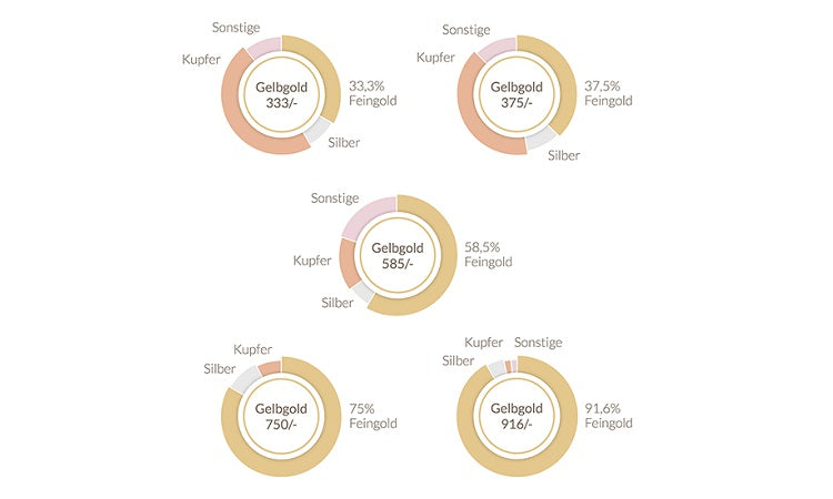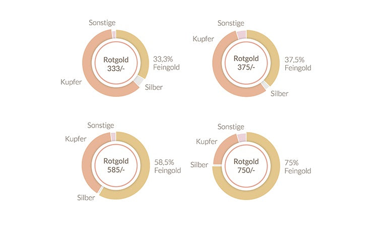 Rubin hat Trauringe in Rotgold in den Legierungen333/-,375/-,585/- und750/-. Auch hier hat die Höhe des Goldgehalts direkte Auswirkungen auf die Qualität und den Wert der Trauringe.