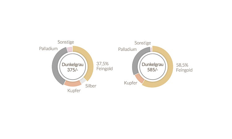 Rubin bietet die eindrucksvolle neue Goldfarbe Graugold dunkel in den Legierungen 375/- und 585/- an.