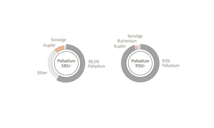 Das eigenständige weiße EdelmetallPalladium gehört zur Platin-Gruppe und wird auch gerne als kleiner Bruder des Platins bezeichnet. Leichter und erschwinglicher als Platin überzeugt es durch viele ähnliche positive Eigenschaften. So ist Palladium ebenfalls sehr hart, widerstandsfähig und farbecht. Zudem hat es wie Platin keinen Abrieb und beste Trageeigenschaften.