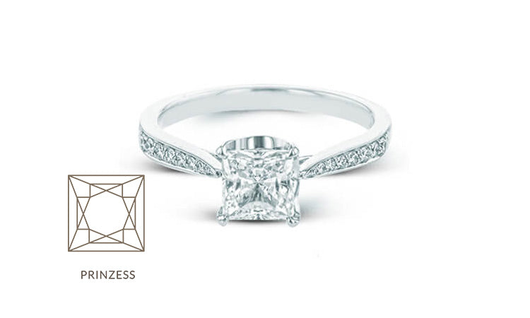 Der Princessschliff ist ebenfalls sehr populär. Aufgrund seiner markanten Form mit den spitzen Ecken wird er besonders gerne in Verlobungsringen verwendet. Schließlich ist die erst in den 1960er Jahren entstandene Schliffform ein besonderer Blickfang und ein perfektes Symbol, um die Liebe zu krönen.