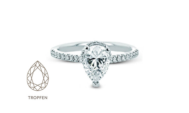 Die legendäre Tropfen-Form erinnert an eine funkelnde Träne und sorgt für einen extravaganten, einzigartigen Look. Die Besonderheit dieser raffinierten Schliffform, die an einem Ende rund und am anderen Ende spitz aussieht, ist die Kombination von Rundschliff und Marquise-Schliff.